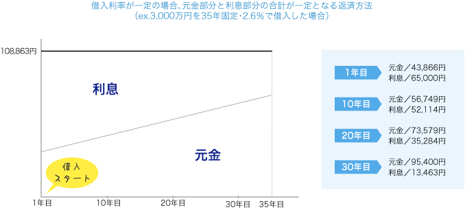 住宅ローンの返済方法には、代表的なものとして「元金均等返済」と「元利均等返済」の2つの方法があります。民間住宅ローンでは、「元金均等返済」はあまり一般的ではありませんが、フラット35や財形融資ではいずれの返済方法も利用可能です。それぞれに次のような特徴がありますので、返済終了までを見据え、収入・支出の見込みや定年・退職の時期などを考慮した返済方法や返済期間を選びましょう。
